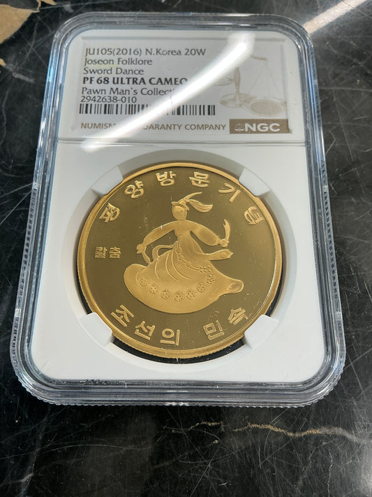 PF68 Ultra Cameo (2016) N. Korea 20 Won Joseon Folklore- Sword Dance