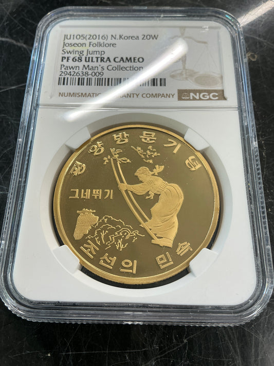 PF68 Ultra Cameo (2016) N. Korea 20 Won Joseon Folklore- Swing Jump