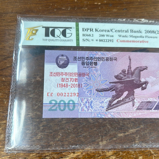 DPRK CENTRAL BANK GEM UNC Exceptional Paper Quality 200 Won 2018 70th Anniversary DPRK Commemorative TQG 66 PPQ