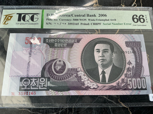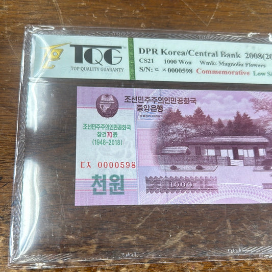 DPRK CENTRAL BANK GEM UNC Exceptional Paper Quality 1000 Won 2018 70th Anniversary DPRK Commemorative TQG 66 PPQ LOW SERIAL NUMBER
