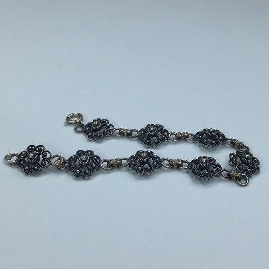 Vintage Sterling Silver 925, Antiqued Finish Floral Link Bracelet 7.25”